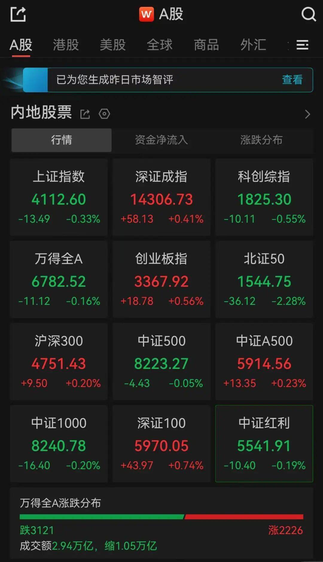 Wind数据显示,截至收盘,全天成交额为2.94万亿元,较昨日缩量1.05万亿元。全天超3100个股下跌。